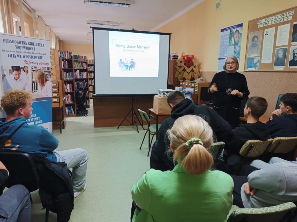 W dniu 27. 11. 25 r. uczniowie kl. 3 T ME wzięli udział w lekcji „Mamy dobre maniery – młodzieżowy savoir-vivre” w Pedagogicznej Bibliotece Wojewódzkiej w Kielcach Filii we Włoszczowie.
