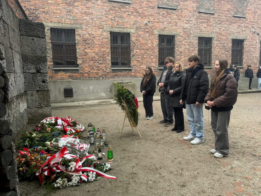 Podczas zwiedzania obozu nasi uczniowie mieli okazję poznać historię jego powstania oraz warunki życia więźniów w Auschwitz i Birkenau. Wzruszającym dla wszystkich momentem było złożenie wiązanki kwiatów pod Ścianą Straceń.