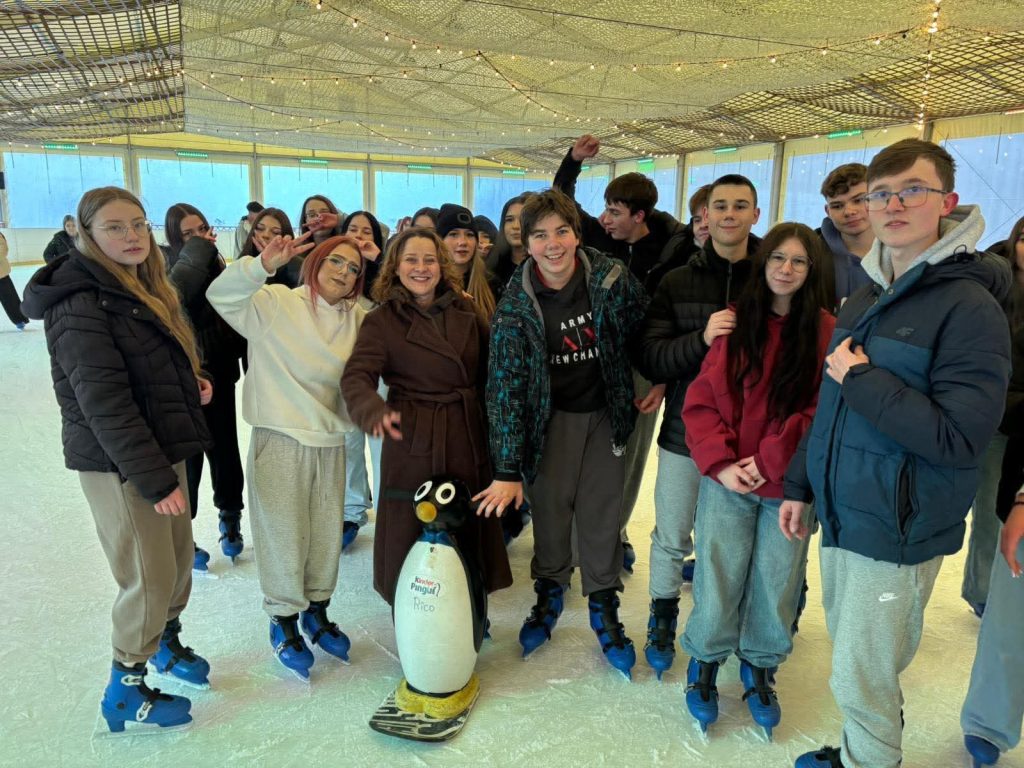 Następnie uczestniczyli w inspirujących warsztatach w Energetyczne Centrum Nauki pt. „Świecące w ciemności – luminescencja”, podczas których nauka dosłownie… rozbłysła! Nie zabrakło także aktywności fizycznej – integracja klasowa na lodowisku dostarczyła mnóstwo radości, śmiechu i sportowych emocji.