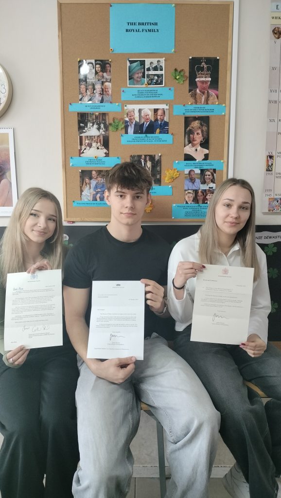 Nauka języka angielskiego w szkole to nie tylko uczenie się nowego słownictwa czy doskonalenie gramatyki, ale to również szansa na praktyczne wykorzystanie własnych umiejętności. Uczniowie klasy IV B LO przekonali się o tym w trakcie zajęć, gdy stanęli przed zadanie napisania listu oficjalnego do wybranego przedstawiciela brytyjskiej rodziny królewskiej. Powstały więc listy do Króla Karola III, Księcia Williama, Księżniczki Kate i Księżniczki Anny, na które młodzież dostała odpowiedzi!! Czytanie ich dostarczyło wielu pozytywnych emocji i dało uczniom ogromną satysfakcję.