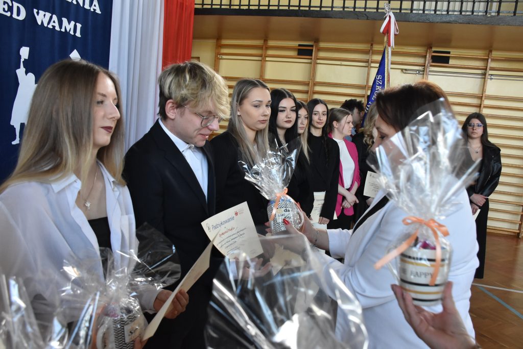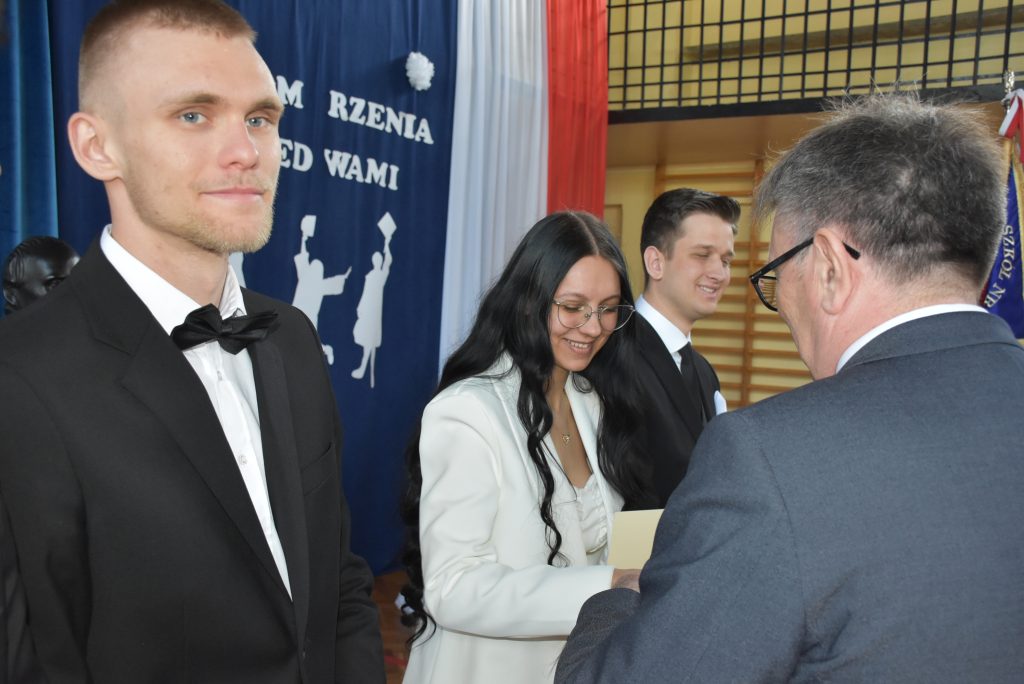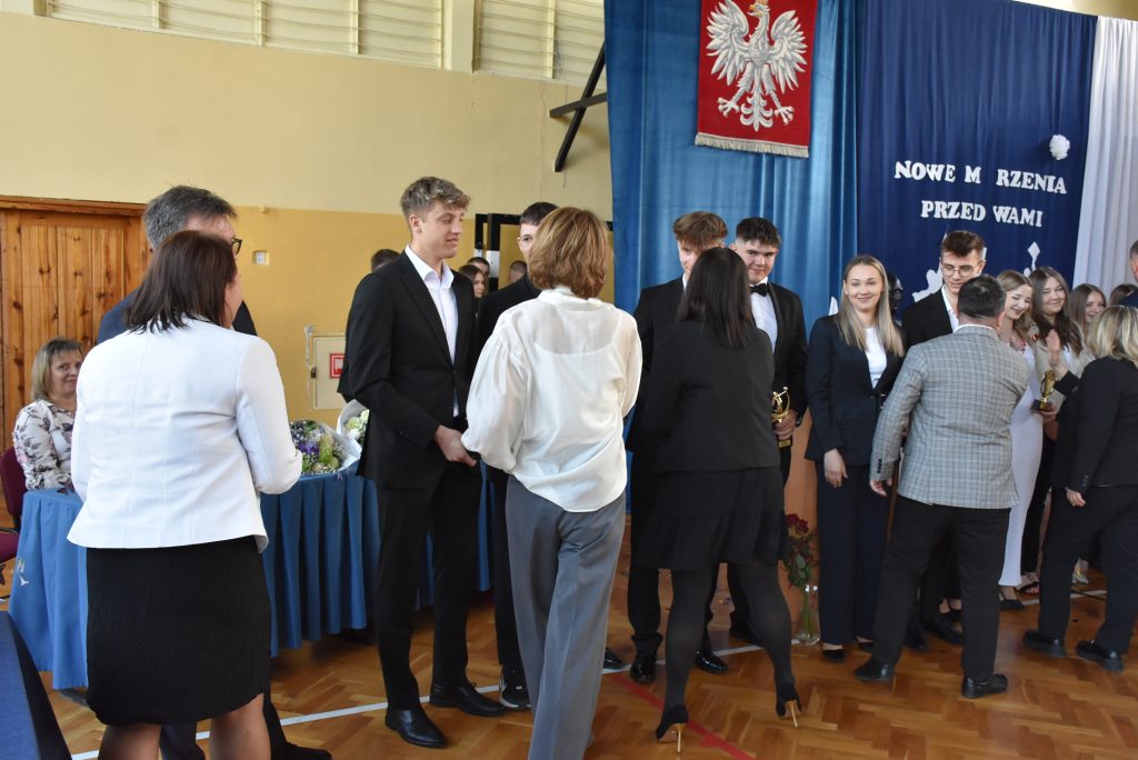 Podczas uroczystości absolwenci ze wzruszeniem podziękowali swoim wychowawcom, wręczając im kwiaty jako wyraz wdzięczności za lata wsparcia, cierpliwości i wspólnej pracy.